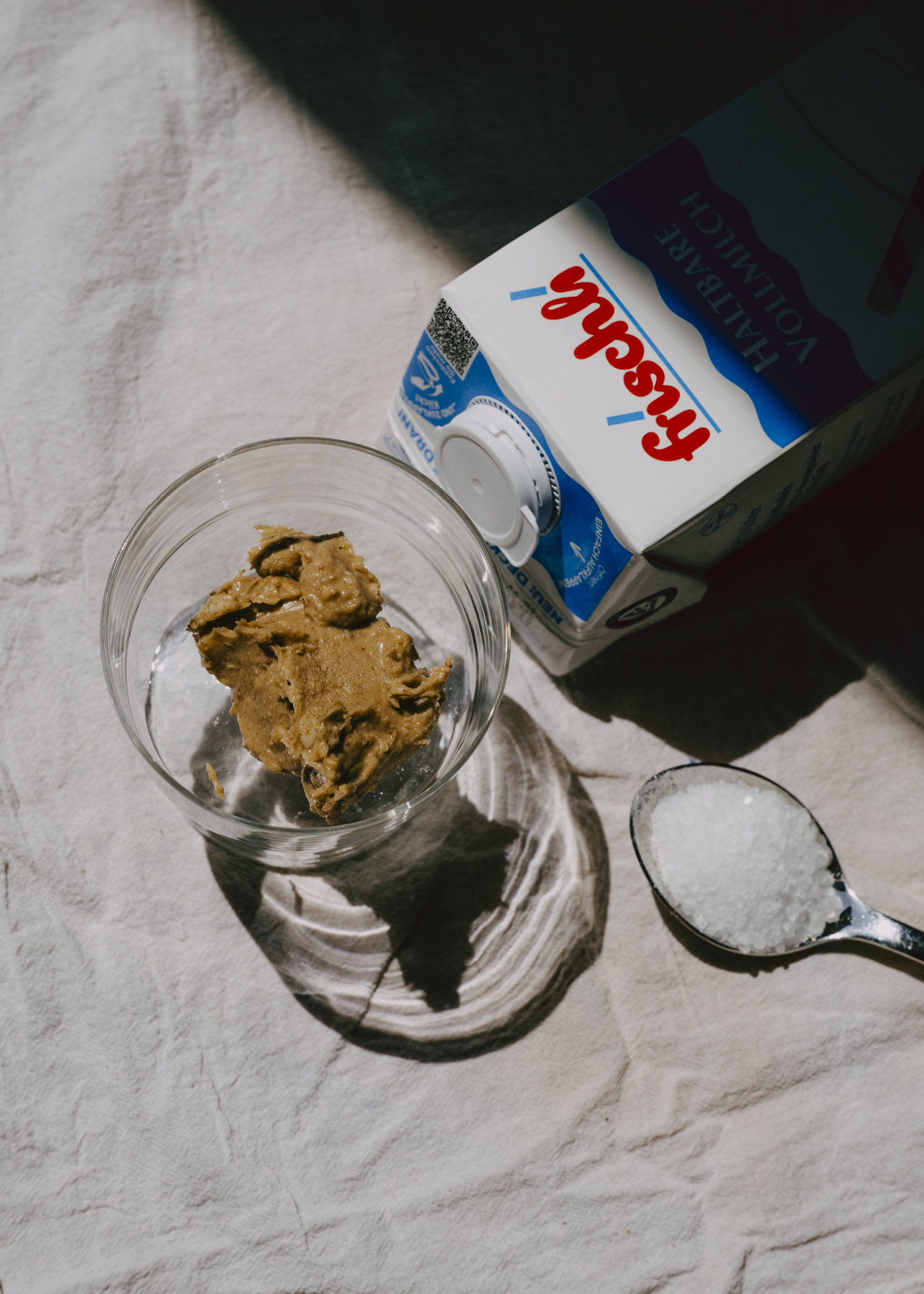 1. Erdnussbutter, Salz und Espresso zu einer cremigen Paste verrühren.